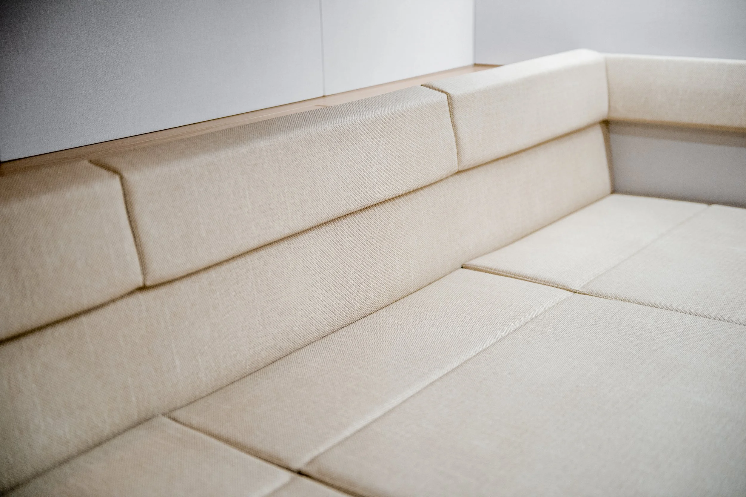 U-sofa med integrert skyvbart setemodul og kjøleskap (vask og induksjonstopp ikke inkludert) – trekkfarge LINETEX CHALK (LNT-9502)